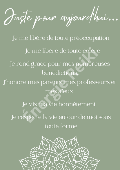 Plongez dans l’énergie bienfaisante du Reiki avec cette affiche inspirante, représentant les 5 idéaux du Reiki, principes fondamentaux pour cultiver la sérénité et l’harmonie au quotidien.